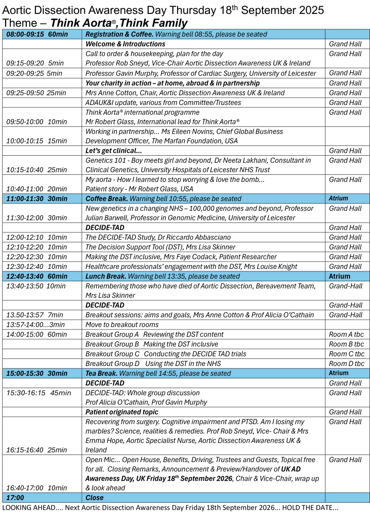 Hosting of the 10th annual Aortic Dissection Awareness Day UK, on Thursday 18th September 2025, is awarded by the national patient charity to the University of Leicester. Please continue reading for our draft Programme for the day…