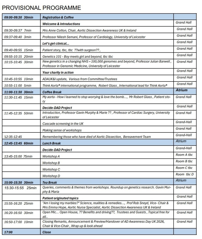 We are delighted to announce that booking is now open for the annual Aortic Dissection Awareness Day, to be held in Leicester on Thursday 18th September 2025.