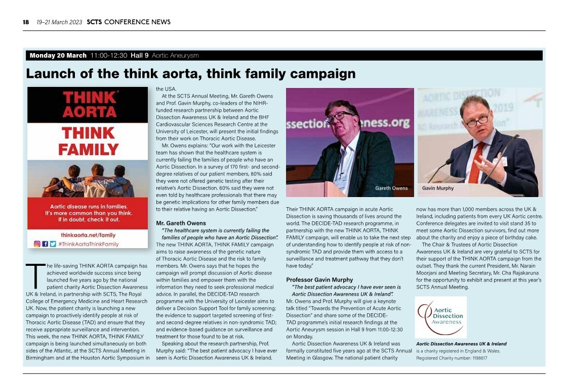 The programme evolved from our 2019 Aortic Dissection Awareness Day UK conference, held in Leicester, which was a large-scale Patient & Public Involvement event attended by 160 patients, relatives, clinicians and researchers. Aortic dissection survivor Mark Lewis, co-leads the programme with Prof. Gavin Murphy, BHF Chair of Cardiac Surgery at the University of Leicester. This is a true research partnership. A team of patients and relatives from our national patient charity contributes to every aspect of the research, co-creating all plans, designs and outputs, advising on PPI and EDI matters, conducting some of the research and disseminating the results. The DECIDE-TAD programme is supported by our THINK AORTA, THINK FAMILY campaign. Mr. Owens and Prof. Murphy presented the initial results of Phase 1 as a keynote talk at the Society for Cardiothoracic Surgery 2023 Annual Meeting and it featured in this article in the conference newsletter.